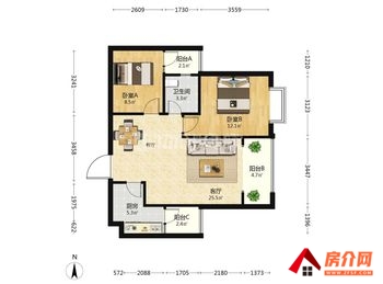 A,户型:标准2室2厅1卫,户型方正温馨